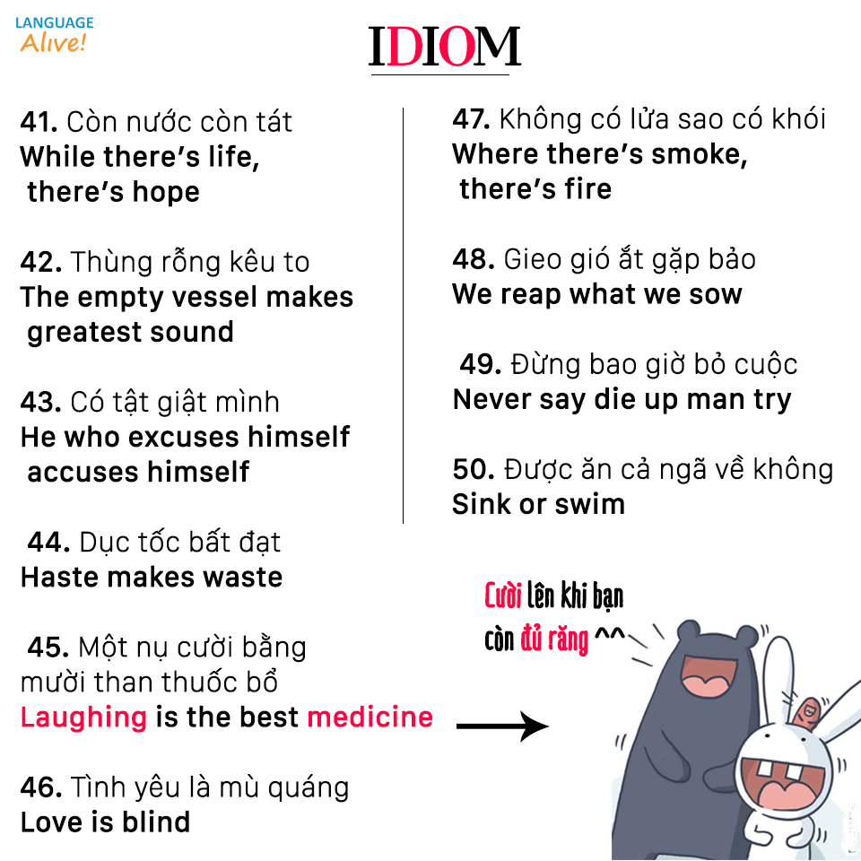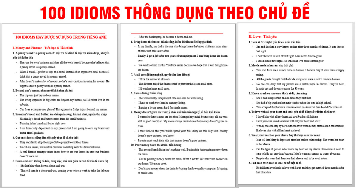 Ngoài ra, tổng hợp những idioms theo các chủ đề như gia đình, sức khỏe hay môi trường cũng rất hữu ích. Khi biết áp dụng chúng trong các bài thi như IELTS hay TOEIC, bạn sẽ tạo được ấn tượng tốt và nâng điểm hiệu quả. Hãy bắt đầu ghi nhớ ngay những idioms này để tự tin hơn trong giao tiếp nhé!