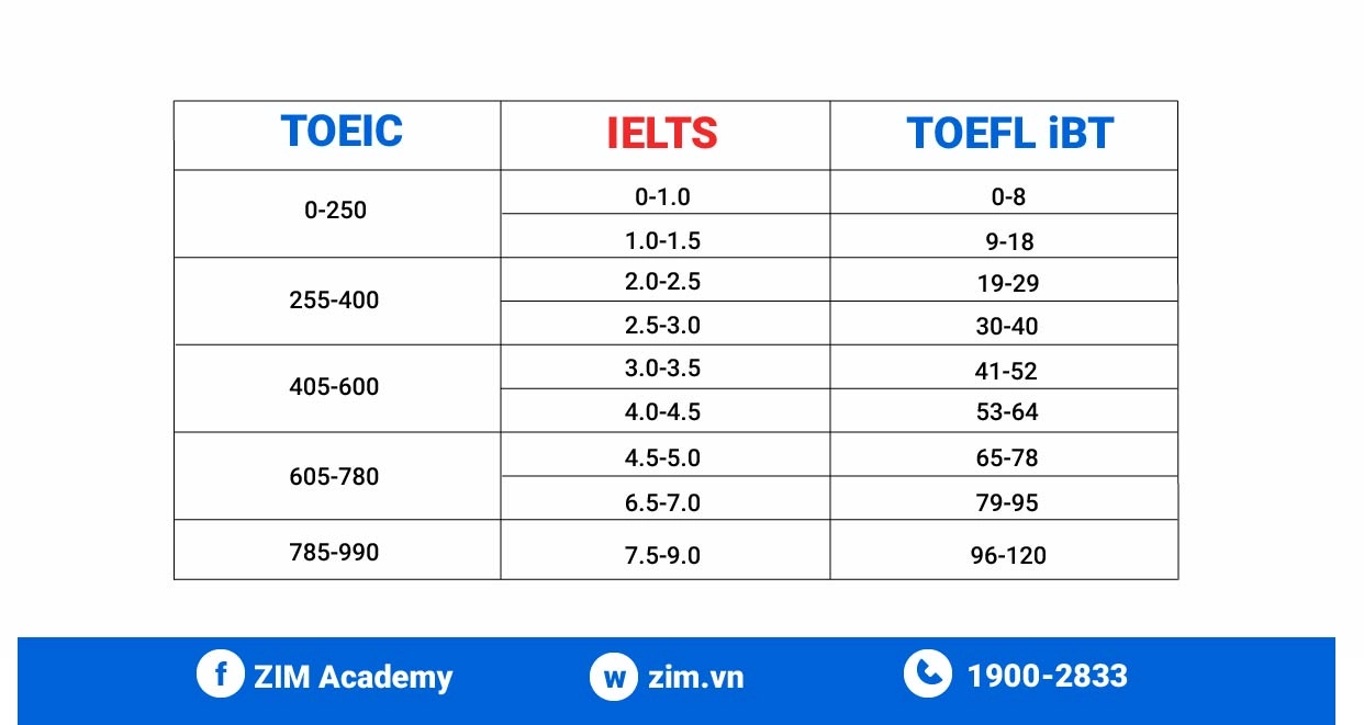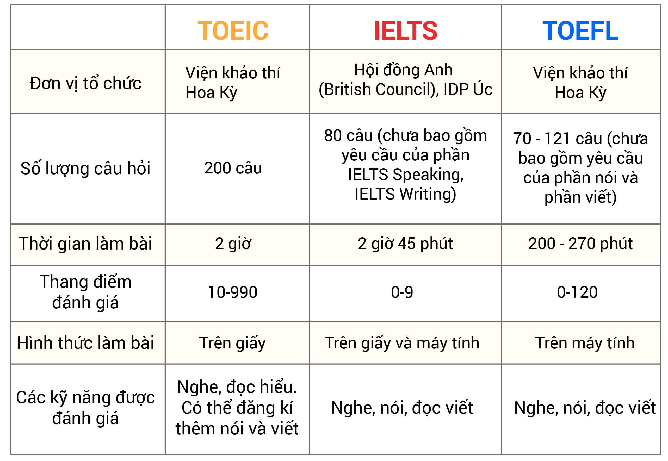 Khi so sánh hai bài thi tiếng Anh phổ biến là TOEIC và IELTS, chúng ta thấy có những khác biệt rõ rệt về thời lượng và thang điểm. Trong khi TOEIC có thang điểm tối đa là 990, IELTS lại sử dụng hệ thống band điểm từ 1.0 đến 9.0 để đánh giá khả năng thành thạo tiếng Anh của thí sinh. Cụ thể, TOEIC đánh giá hai kỹ năng Nghe và Đọc với tổng điểm từ 10 đến 990, còn IELTS đánh giá bốn kỹ năng: Nghe, Đọc, Viết và Nói.