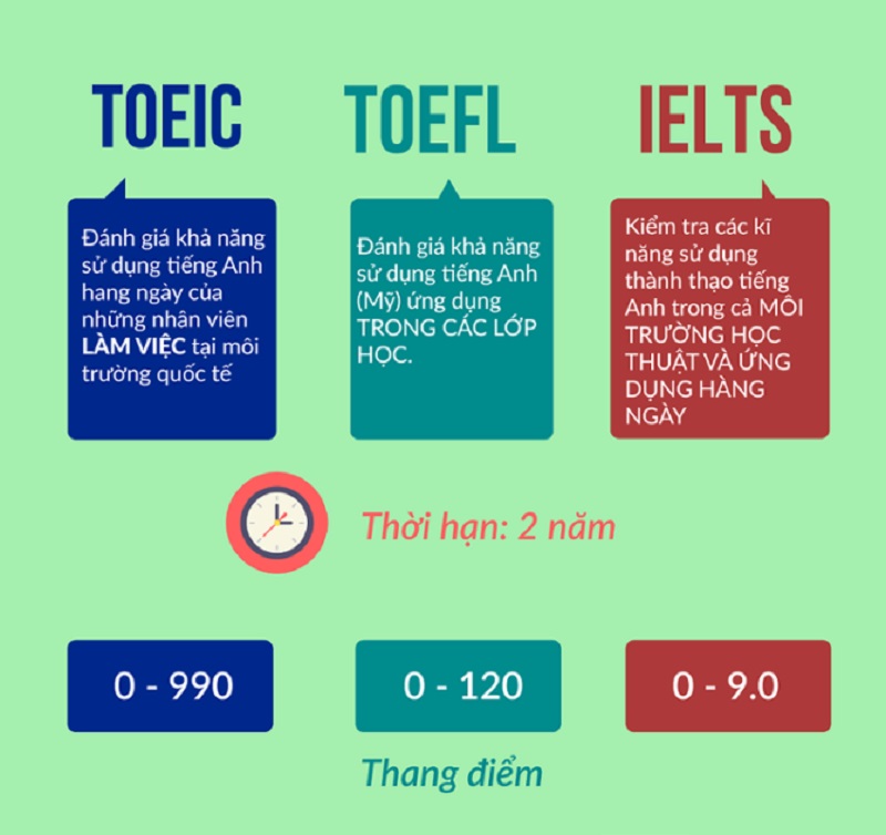 Thời hạn chứng chỉ của cả hai đều là hai năm, nhưng quá trình tổ chức thi cũng khác nhau. IELTS thường được tổ chức hàng tháng với mức độ khó nhằn hơn, trong khi TOEIC cũng diễn ra tương tự nhưng thường không quá căng thẳng. Nếu bạn chỉ cần nhanh chóng có một chứng chỉ để ra trường, TOEIC sẽ là lựa chọn hợp lý hơn.