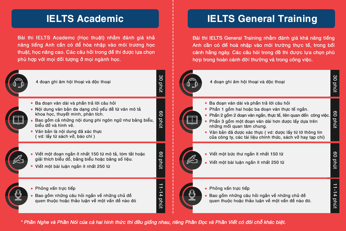 Bài kiểm tra IELTS bao gồm bốn kỹ năng: Nghe, Nói, Đọc và Viết. Điều đặc biệt là bạn có thể chọn giữa hai mô-đun thi: Học thuật và Đào tạo chung, tùy thuộc vào nhu cầu cá nhân. Thời gian thi là 2 giờ 45 phút và cấu trúc bài thi giống nhau ở mọi nơi, tạo sự công bằng cho tất cả thí sinh.