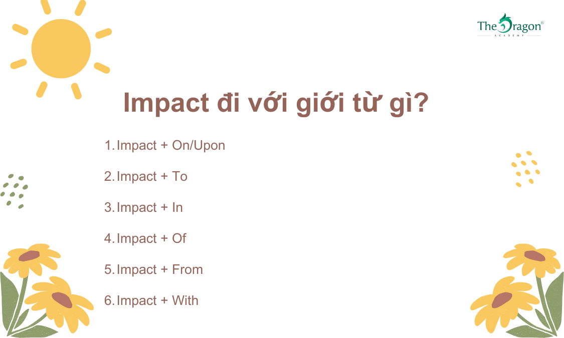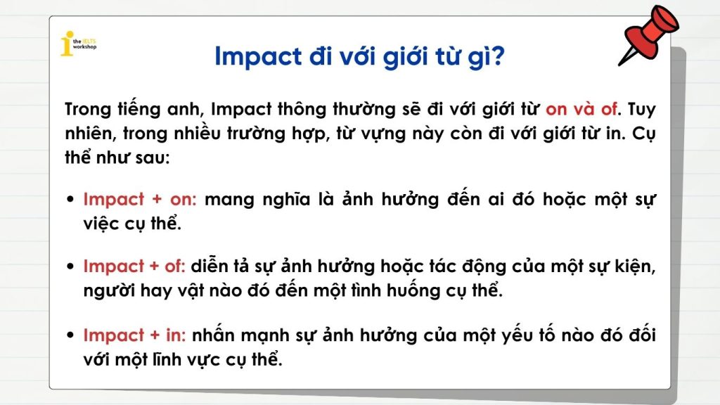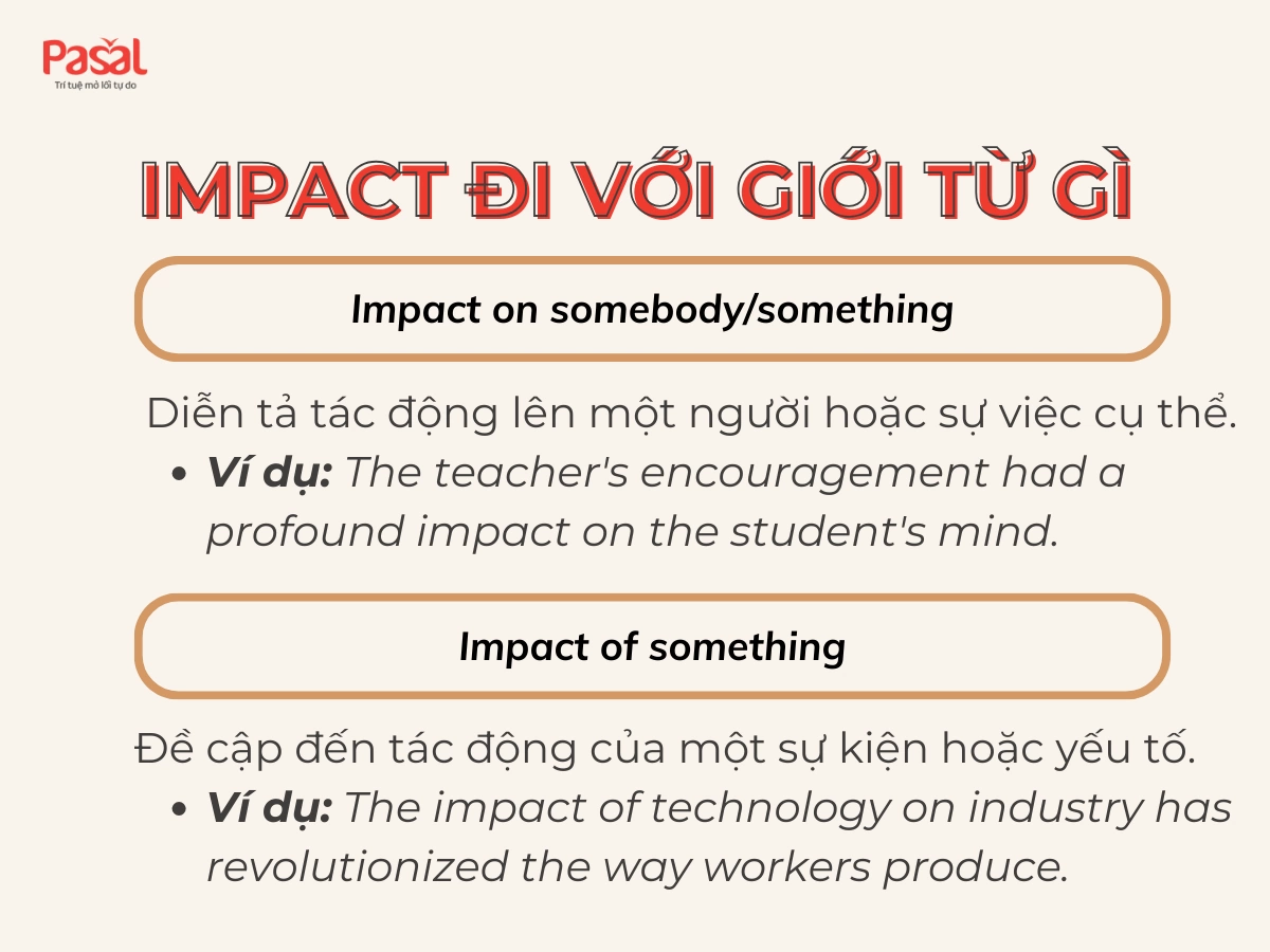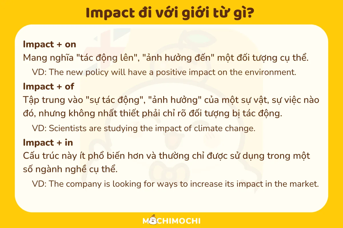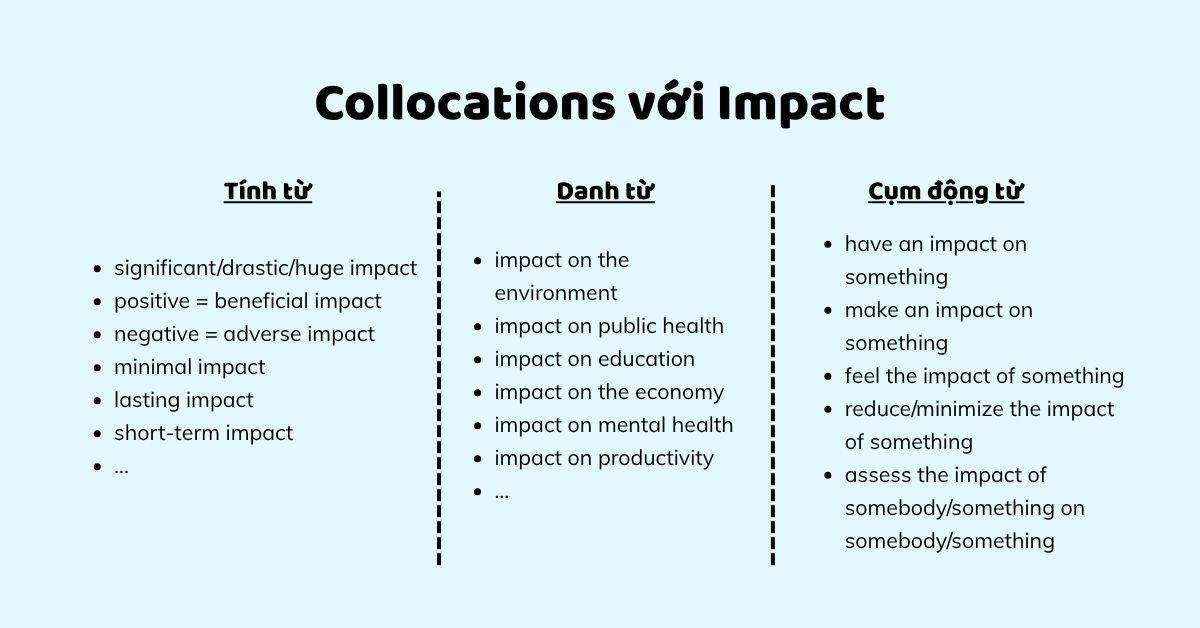 Tóm lại, việc lựa chọn giới từ đi kèm với “impact” rất quan trọng, vì chúng không chỉ giúp diễn đạt ý nghĩa rõ ràng hơn mà còn cung cấp thông tin bổ sung về mối quan hệ giữa các yếu tố được đề cập trong câu. Việc nắm vững cách sử dụng này sẽ giúp bạn giao tiếp hiệu quả hơn trong tiếng Anh.