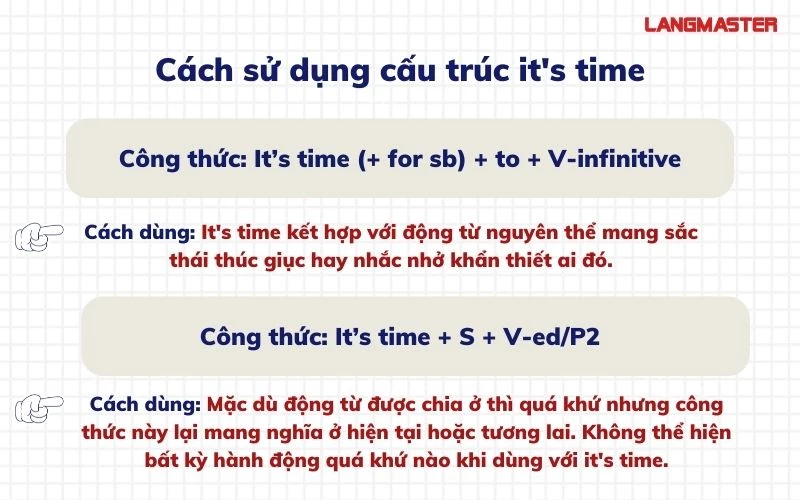 Ngoài ra, “It’s time” cũng có ý nghĩa tương tự, nhưng có thể sử dụng một cách linh hoạt hơn. Khi dùng cùng với động từ nguyên thể, như trong “It’s time to start studying,” cấu trúc này chỉ ra rằng bây giờ là lúc thích hợp để bắt đầu một hoạt động mới. Điều này mang đến cảm giác nhẹ nhàng và tự nhiên hơn so với “It’s high time.”