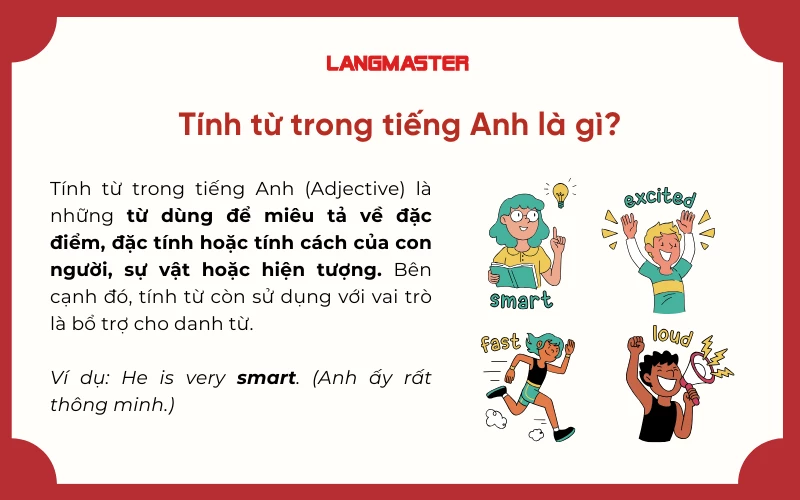Tính từ trong tiếng Anh, kí hiệu là Adj, là những từ dùng để miêu tả và bổ nghĩa cho danh từ. Chúng giúp người nghe, người đọc hình dung rõ hơn về đặc điểm, tính chất của sự vật, hiện tượng hay con người. Chẳng hạn, trong câu “He is very smart” (Anh ấy rất thông minh), từ “smart” là một tính từ miêu tả trí tuệ của nhân vật.