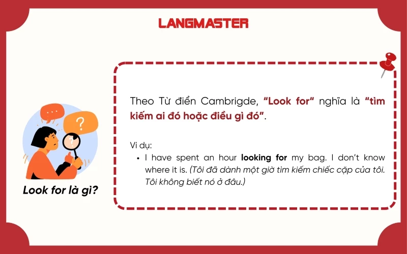 Trong tiếng Anh, cụm động từ “look for” mang ý nghĩa đơn giản nhưng rất thiết thực: tìm kiếm một ai đó hoặc một thứ gì đó. Theo từ điển Cambridge, “look for” được định nghĩa là hành động cố gắng tìm ra điều mình đang thắc mắc hoặc đã mất. Chắc hẳn chúng ta đều đã từng trải qua những lúc đi tìm một món đồ và câu nói “I have spent an hour looking for my bag” phản ánh rất rõ tâm trạng này.