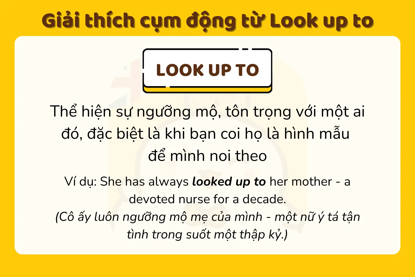 Chưa dừng lại ở đó, “look up” cũng có thể được kết hợp với giới từ “to” để tạo thành cụm “look up to”. Cụm từ này thể hiện sự ngưỡng mộ và tôn trọng đối với ai đó. Ví dụ, một người có thể “look up to” cha mẹ hoặc thầy cô của mình vì những phẩm chất tốt đẹp mà họ sở hữu. Với những ý nghĩa trên, “look up” thật sự là một cụm từ rất đáng ghi nhớ trong tiếng Anh.