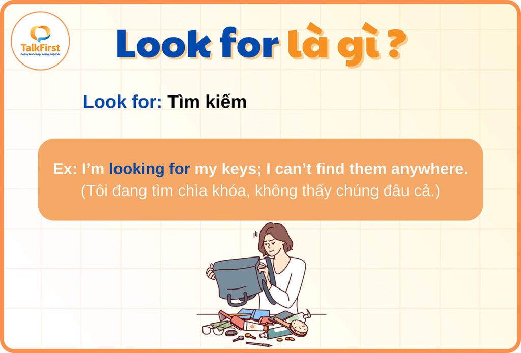 Cụm động từ “look for” có nghĩa là tìm kiếm ai đó hoặc điều gì đó, và đây là một phần quan trọng trong cuộc sống hàng ngày của chúng ta. Chắc hẳn ai cũng đã từng trải qua cảm giác hụt hẫng khi không thể tìm thấy đồ vật cần thiết, như trong trường hợp tôi đã từng nói: “Tôi đang tìm chìa khóa của mình. Bạn có thấy chúng không?”.