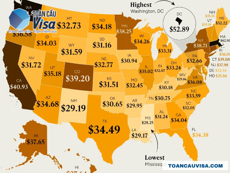 Mức lương trung bình tại Mỹ hiện nay khá đa dạng và phụ thuộc vào từng tiểu bang cũng nhưNgành nghề. Theo Cục Thống kê Lao động, mức lương trung bình hàng năm là khoảng 59.428 USD, tương ứng với mức lương giờ là 28,34 USD. Điều này có nghĩa là một công nhân có thể kiếm từ 15 đến 35 USD mỗi giờ, tạo ra thu nhập hàng tháng dao động từ 3.000 đến 6.000 USD nếu làm việc đủ 40 giờ mỗi tuần.