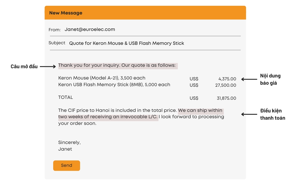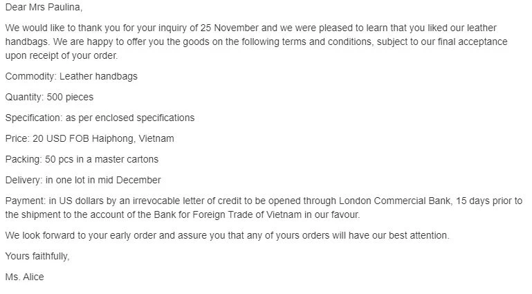 Bắt đầu với lời chào trang trọng như “Dear Mr./Ms./Mrs.” và sau đó là một câu hỏi thăm thân thiện có thể tạo ra không khí tốt cho email. Đi vào phần giới thiệu, bạn cần nêu rõ lý do bạn viết thư, cung cấp thông tin về mức giá, các điều khoản thanh toán và thời gian giao hàng. Hãy nhớ rằng, khách hàng luôn mong muốn biết rõ những giá trị họ nhận được, vì vậy bạn có thể nêu bật các chính sách chiết khấu hay ưu đãi đặc biệt.