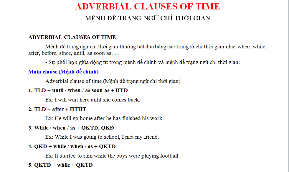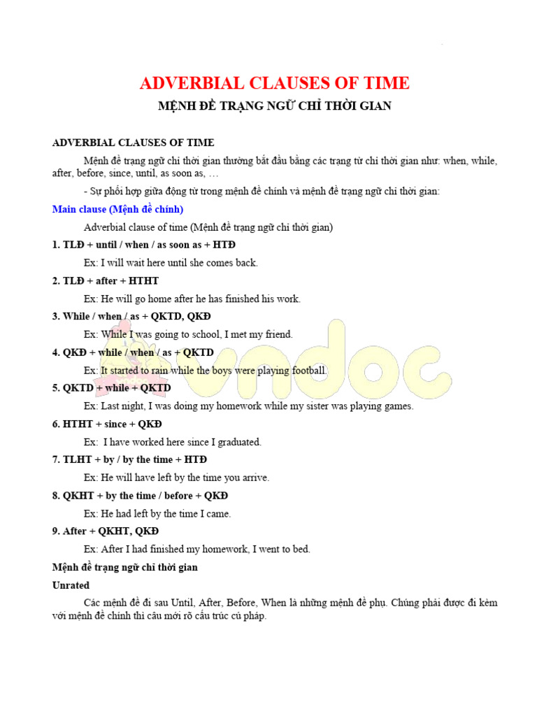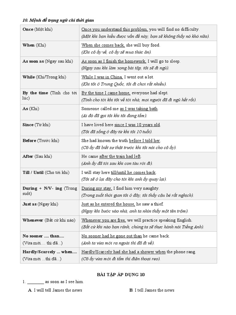 Mệnh đề trạng ngữ chỉ thời gian là một phần quan trọng trong cấu trúc câu, giúp chúng ta nắm bắt thời điểm của các hành động. Với 50 bài tập từ cơ bản đến nâng cao, tài liệu này không chỉ cung cấp lý thuyết mà còn hướng dẫn thực hành, giúp học sinh ghi nhớ và sử dụng chúng một cách hiệu quả.
