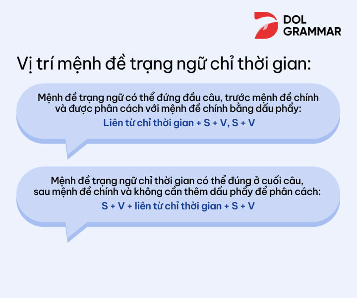 Một điều thú vị là mệnh đề trạng ngữ chỉ thời gian có thể đứng ở vị trí đầu hoặc cuối câu. Nếu bạn đặt nó ở đầu câu, có thể tạo ra sự chú ý ngay từ đầu cho người nghe. Theo đó, việc sử dụng hợp lý các liên từ sẽ làm cho câu văn thêm phần sinh động và rõ ràng.
