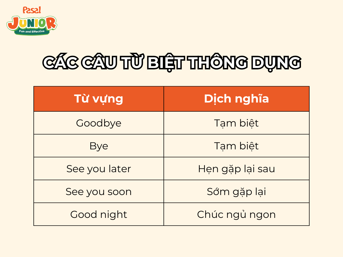 Ngoài ra, những câu tạm biệt như “Goodbye” hay “Bye bye” cũng rất quan trọng, giúp bé biết cách kết thúc cuộc trò chuyện. Bố mẹ có thể khuyến khích trẻ sử dụng những mẫu câu này mỗi ngày để bé dần tự tin hơn.