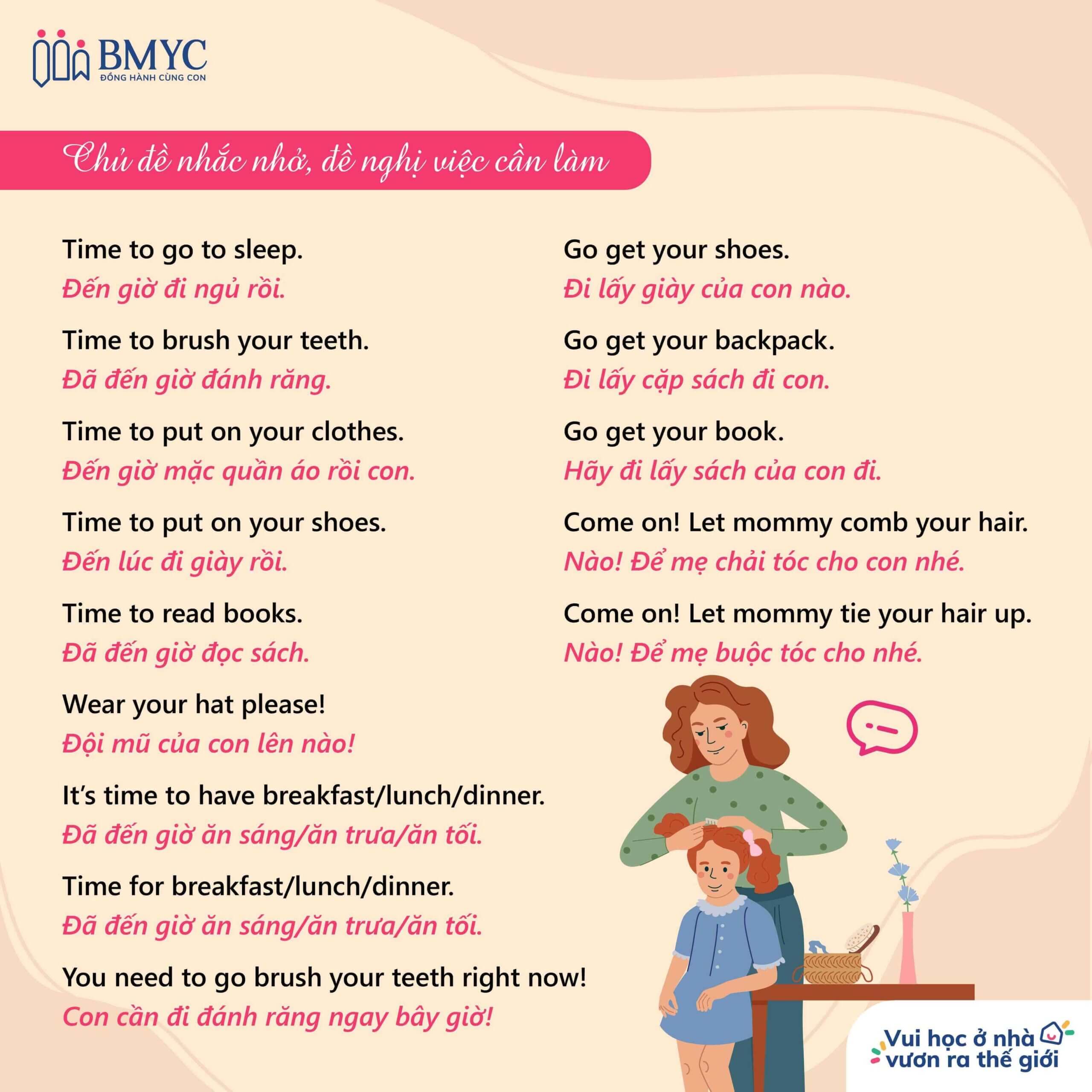 Bên cạnh đó, những câu chỉ dẫn như “Time to put on your shoes” (Đến lúc đi giày) hay “Time to read books” (Đến lúc đọc sách) sẽ giúp bé liên kết việc học tiếng Anh với các hoạt động hằng ngày. Hãy kiên nhẫn và thường xuyên trò chuyện với trẻ để kỹ năng của bé dần hoàn thiện!
