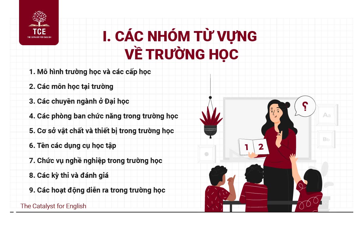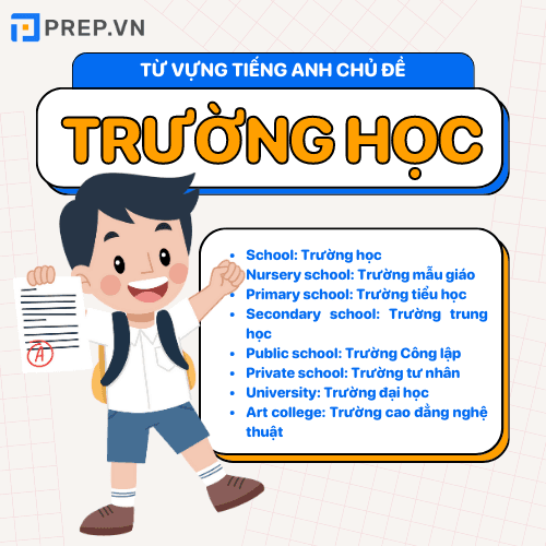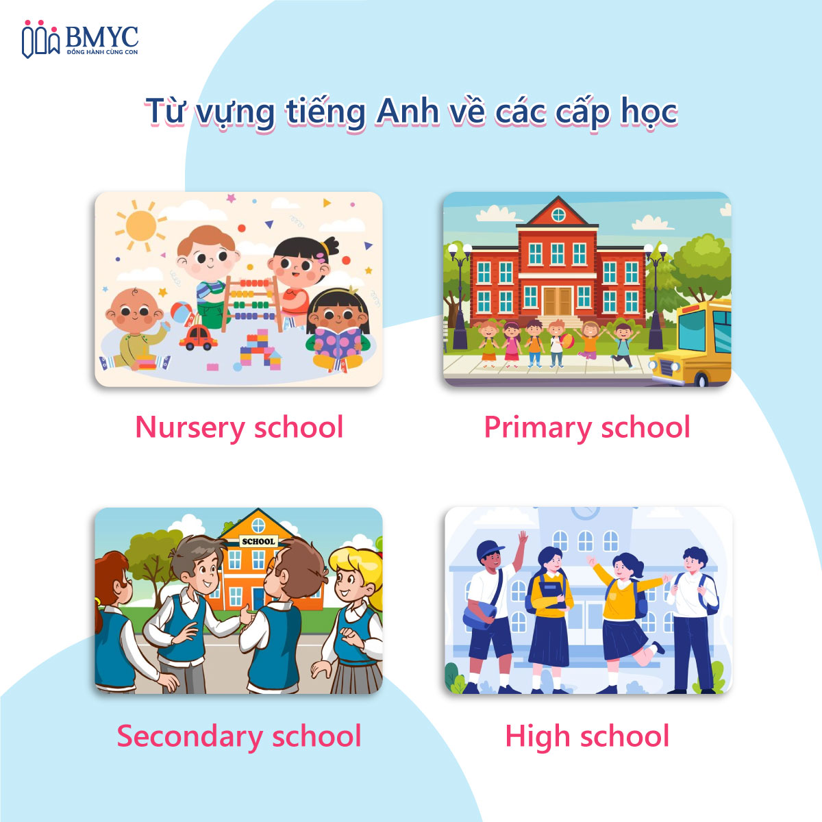 Tiếng Anh có nhiều từ vựng liên quan đến trường học, là một phần quan trọng trong việc giao tiếp của học sinh. Đầu tiên, chúng ta có thể nhắc đến các loại trường học như nursery school (trường mẫu giáo), primary school (trường tiểu học), và secondary school (trường trung học). Đặc biệt, high school (phổ thông trung học) và college (cao đẳng) cũng là những từ rất quen thuộc với các bạn học sinh.