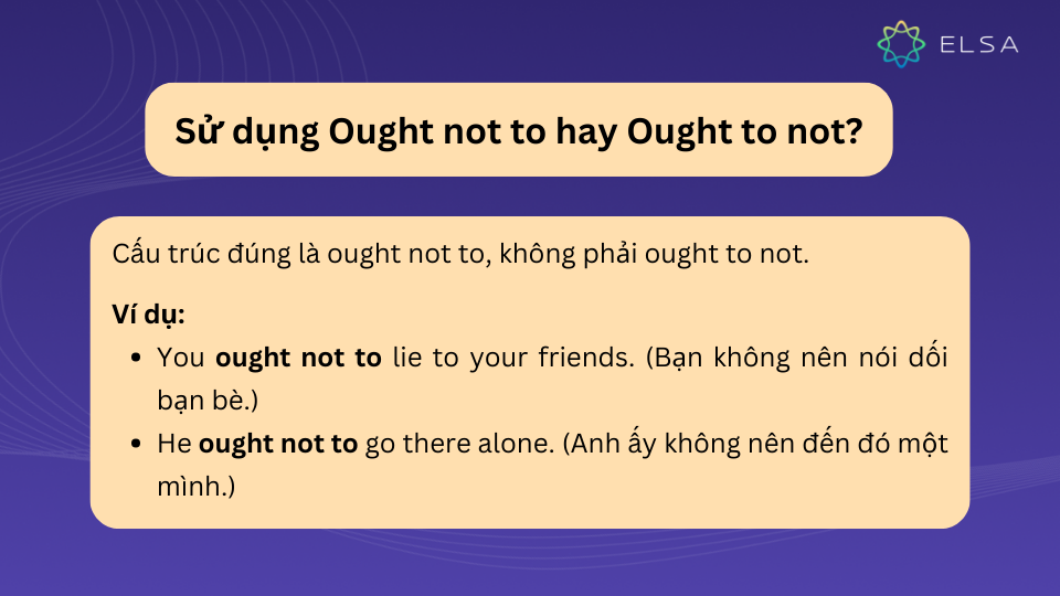 Một điều thú vị là cấu trúc phủ định của “ought to” là “ought not to”, thường được viết tắt là “oughtn’t”. Việc sử dụng này cho thấy rằng một hành động nào đó không nên được thực hiện, ví dụ: “He ought not to smoke so much” – có nghĩa là việc hút thuốc nhiều là không tốt.
