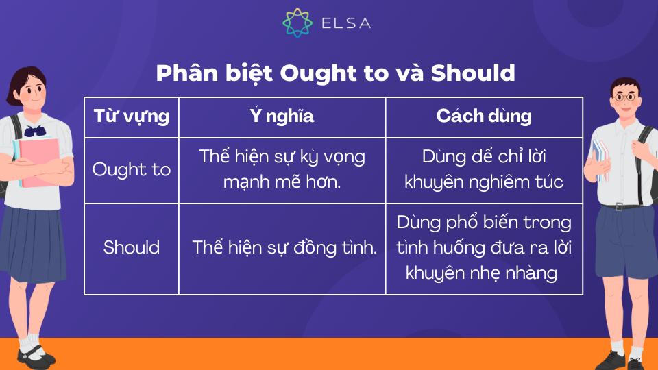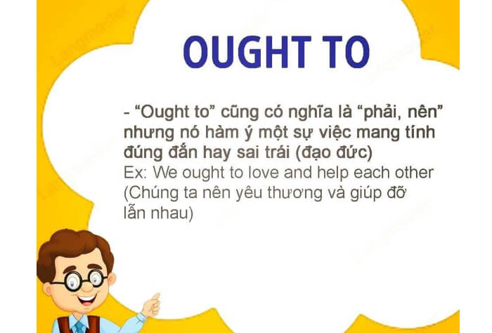 “Ought to” và “should” đều là những động từ khuyết thiếu rất phổ biến trong tiếng Anh, thường được sử dụng để đưa ra lời khuyên hoặc biểu thị sự bắt buộc. Trong khi “should” có thể nghe mạnh mẽ hơn, thì “ought to” lại mang tính nhẹ nhàng và lịch sự hơn. Bên cạnh đó, cấu trúc phủ định của “ought to” là “ought not to”.