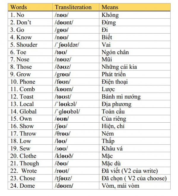 Phát âm chữ “O” trong tiếng Anh có nhiều cách khác nhau, và điều này đôi khi gây khó khăn cho người học. Trong trường hợp chữ “O” đứng trước các âm như “od”, “ol”, “on”, “ose”, “ot”, “se”, “ugh”, và “ve”, nó thường được phát âm là /u:/. Để phát âm đúng, bạn nên mở môi ra phía trước và tạo khẩu hình miệng giống như khi phát âm chữ “O”.