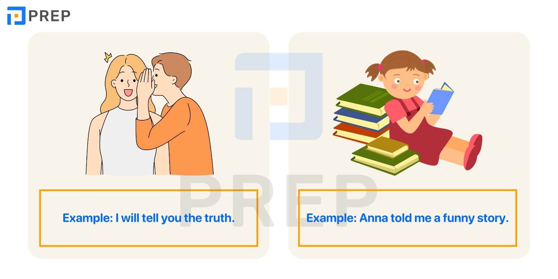 Ví dụ, khi bạn muốn hỏi một ai đó liệu họ có biết tên của một người, bạn có thể hỏi: “Did she tell you her name?” (Cô ấy nói với bạn tên của cô ấy à?). Còn ở dạng khẳng định, bạn có thể nói: “He told the news to everybody he saw.” (Anh ấy báo tin cho tất cả những người anh ấy gặp).