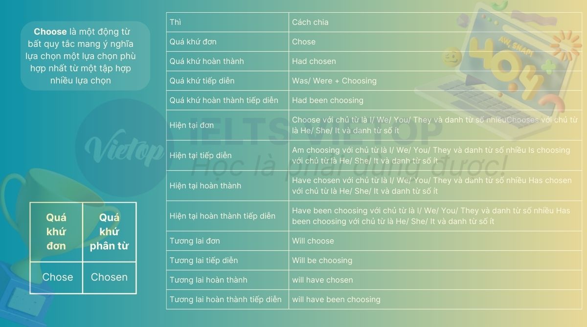 Trong tiếng Anh, mỗi động từ đều có các dạng quá khứ khác nhau, và “choose” cũng không ngoại lệ. Đây là một trong những động từ thường gặp và được sử dụng phổ biến trong giao tiếp hàng ngày cũng như trong các kỳ thi tiếng Anh. Vậy quá khứ của “choose” là gì, cách dùng ra sao và có những lưu ý nào quan trọng khi sử dụng? Bài viết dưới đây sẽ giúp bạn hiểu rõ hơn về quá khứ đơn của “choose”, cấu trúc ngữ pháp, cách sử dụng cũng như một số ví dụ minh họa cụ thể để bạn dễ dàng nắm bắt và ghi nhớ.