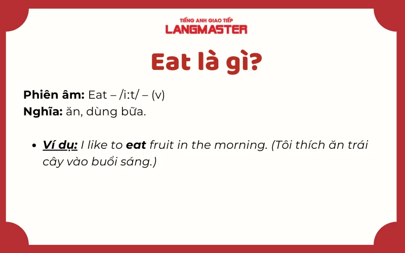 Trong tiếng Anh, “eat” là động từ có nghĩa là “ăn”. Động từ này rất thông dụng trong giao tiếp hàng ngày. Khi nói về quá khứ, “eat” chuyển thành “ate”, đây chính là dạng quá khứ đơn (V2) của nó. Ví dụ, khi bạn muốn diễn đạt việc đã ăn món gì đó trong quá khứ, bạn có thể nói: “I ate eggs for breakfast yesterday” (Tôi đã ăn trứng vào bữa sáng hôm qua).