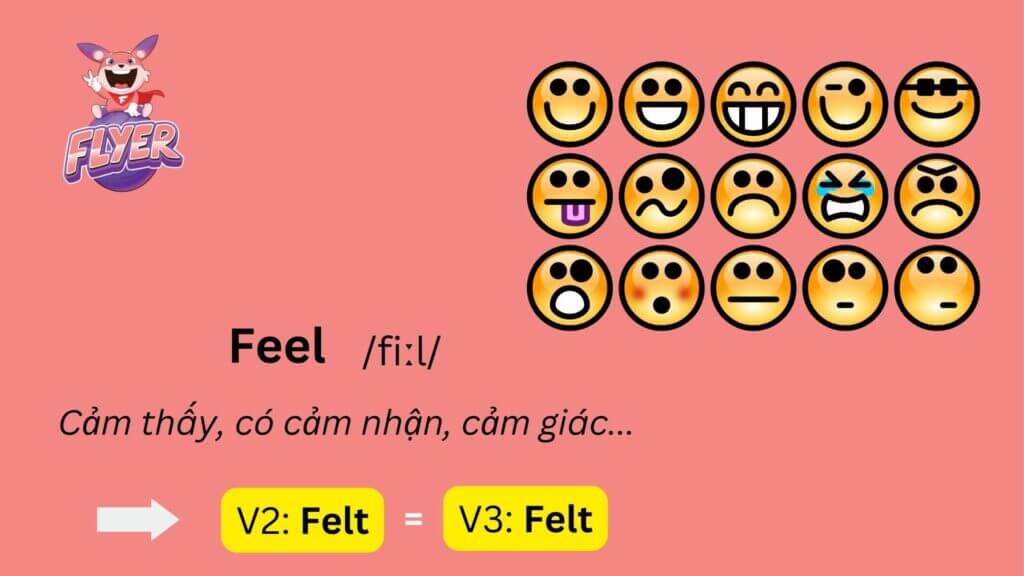Khi nhắc đến động từ “feel” trong tiếng Anh, chúng ta thường nghĩ đến cảm xúc hoặc trạng thái tâm lý của mình. Động từ này rất đặc biệt vì nó thuộc loại bất quy tắc. Cụ thể, dạng nguyên thể của nó là “feel” và khi chia ở quá khứ đơn, chúng ta sử dụng “felt”. Điều này cũng đúng với quá khứ phân từ, có nghĩa là “felt” được viết giống nhau ở cả hai dạng này.