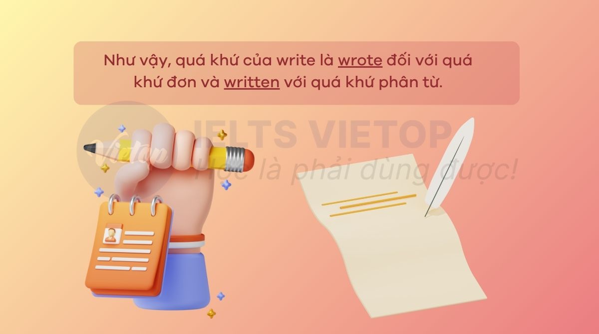 Ngoài “wrote”, chúng ta cũng cần biết đến “written”, là quá khứ phân từ của “write”. Hình thức này thường được dùng trong các cấu trúc ngữ pháp phức tạp hơn, chẳng hạn như thì hoàn thành. Khi chúng ta nói “I have written two books”, “written” thể hiện rằng hành động hoàn tất nhưng vẫn liên quan đến hiện tại.