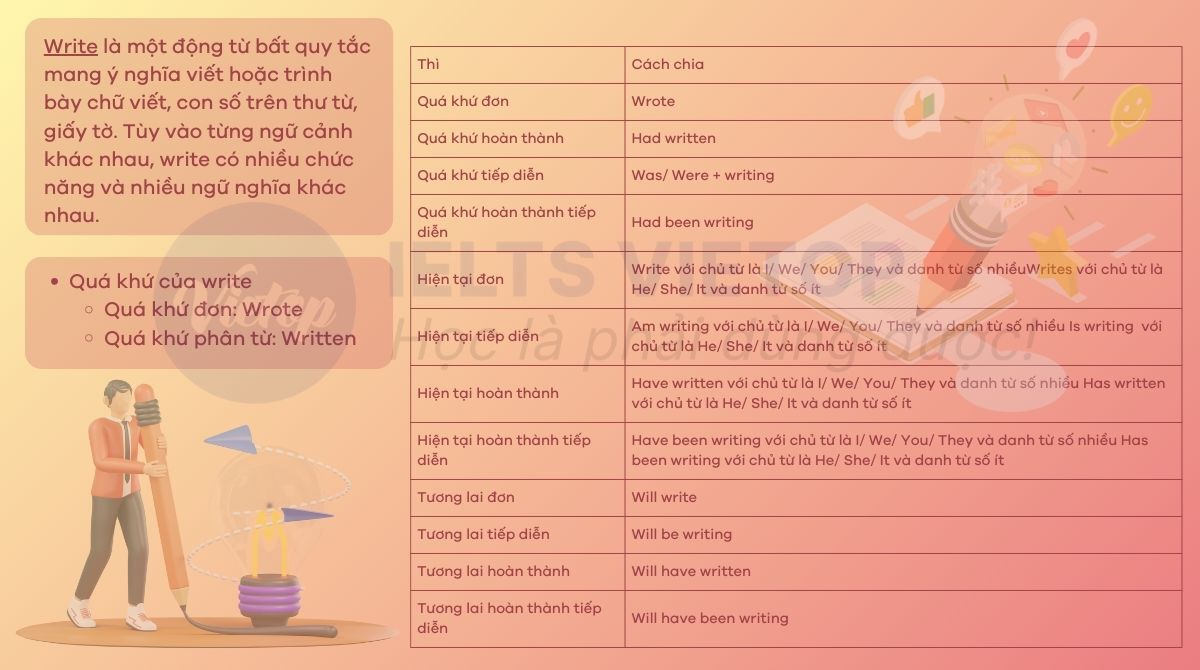 Tóm lại, việc nắm vững quá khứ và quá khứ phân từ của “write” không chỉ giúp bạn giao tiếp hiệu quả hơn mà còn thể hiện sự chính xác trong ngữ pháp. Hãy luyện tập để trở nên thành thạo hơn nhé!