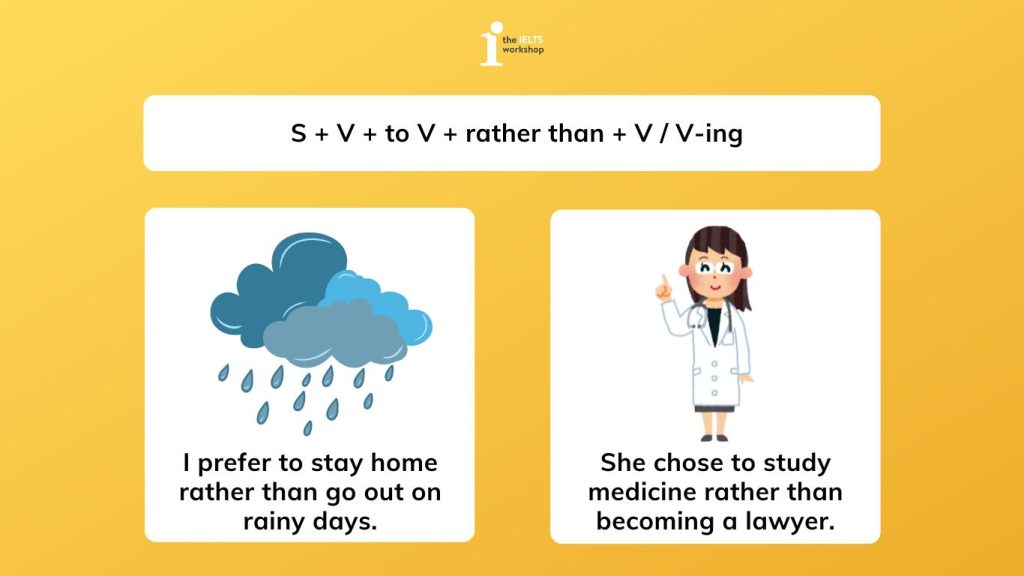 Rather than là một cụm từ rất hữu ích trong tiếng Anh khi chúng ta muốn diễn đạt sự ưa thích hoặc lựa chọn giữa hai hành động khác nhau. Bạn có thể thấy rằng nó thường đi kèm với động từ ở dạng nguyên mẫu không “to” hoặc V-ing, tùy thuộc vào cách diễn đạt trước đó.