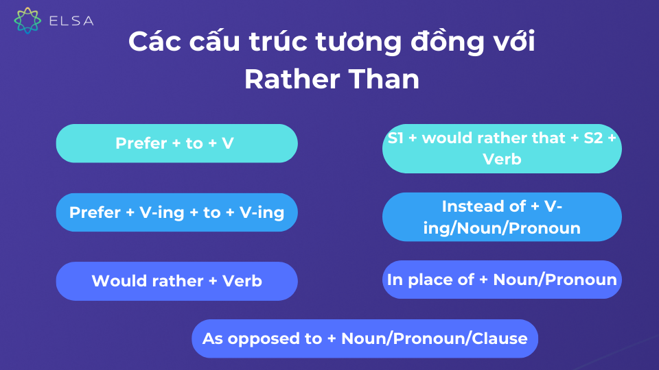 Cấu trúc này không chỉ áp dụng cho động từ mà còn cho danh từ, tính từ hay trạng từ. Điều này làm cho “rather than” trở thành một công cụ mạnh mẽ giúp bạn diễn tả sự ưu tiên một cách rõ ràng và sinh động. Việc nắm vững cách sử dụng này sẽ giúp bạn giao tiếp hiệu quả hơn trong tiếng Anh.