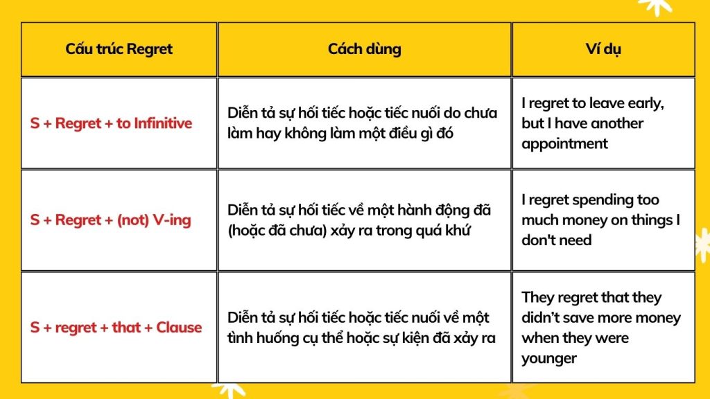 Nói chung, khi sử dụng “regret,” bạn đang thể hiện một cảm xúc chân thành. Cách chọn cấu trúc phù hợp sẽ giúp bạn truyền tải thông điệp một cách chính xác và rõ ràng.