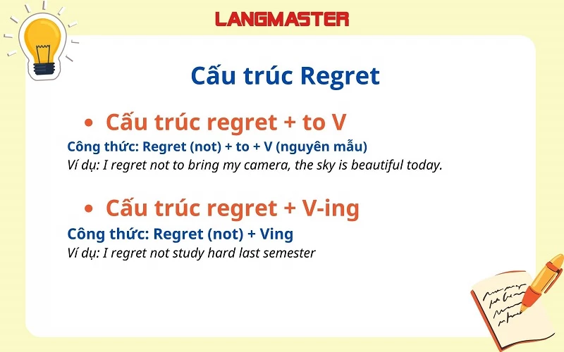 Mặc dù “regret” thường đi với “-ing,” nhưng trong những tình huống chính thức, “regret to V” cũng xuất hiện. Hiểu rõ cách sử dụng sẽ giúp bạn diễn đạt cảm giác tiếc nuối một cách tự nhiên và phù hợp trong giao tiếp hàng ngày.