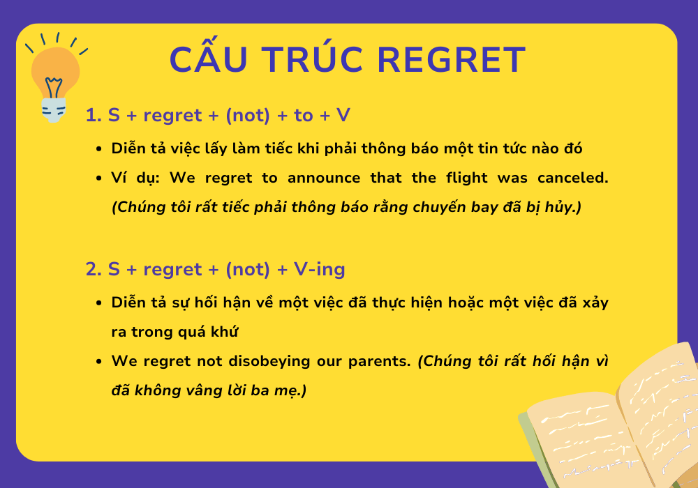 Ngoài ra, “regret” cũng có thể được sử dụng trong cấu trúc “regret + to V”, thường được áp dụng khi bạn phải thông báo những tin không vui. Chẳng hạn như trong tình huống “We regret to inform you that the flight has been canceled.”