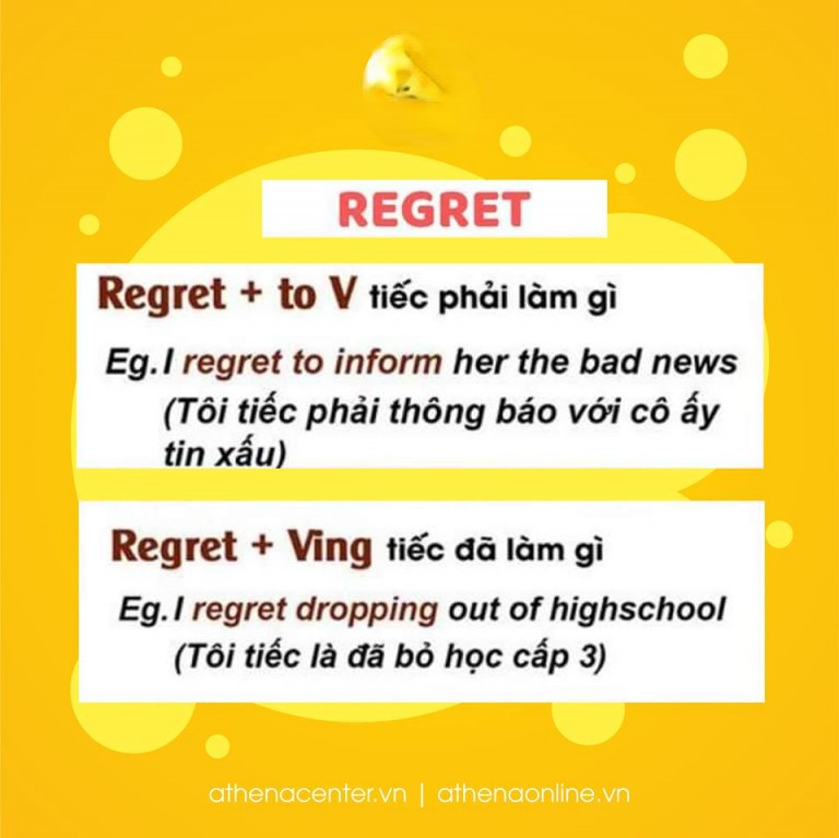 Ngược lại, cấu trúc “Regret + to V” thường được dùng để thông báo tin buồn hay không may về điều gì đó. Khi dùng cấu trúc này, bạn có thể nói: “I regret to inform you that the event has been canceled,” thể hiện sự tiếc nuối khi phải thông báo về một tin không vui. Thực tế, người nói thường cảm thấy khó khăn khi phải dùng cấu trúc này vì nó liên quan đến cảm xúc tiêu cực.