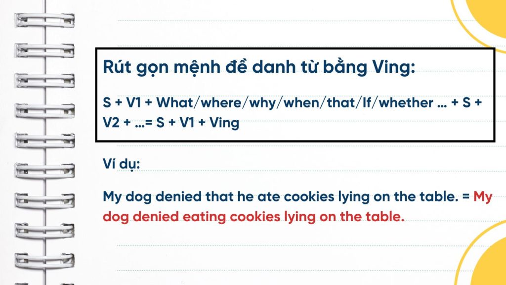 Mệnh đề danh từ thường bắt đầu bằng các từ như that, what, who, và những từ hỏi thông dụng khác. Để rút gọn, có hai cách phổ biến: rút gọn bằng to V và rút gọn bằng V-ing. Ví dụ, nếu mệnh đề danh từ bắt đầu bằng that và đóng vai trò như tân ngữ, chúng ta có thể đơn giản hóa nó bằng cách bỏ từ that và chuyển động từ về dạng V-ing.