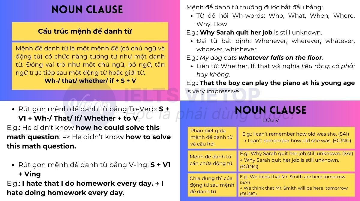 Mệnh đề danh từ là một trong những phần quan trọng trong ngữ pháp tiếng Anh, đóng vai trò như một danh từ trong câu. Khi sử dụng, mệnh đề này thường khởi đầu bằng các từ như “that”, “whether”, “if” hoặc các từ nghi vấn như “what”, “who”, “how”. Vì vậy, việc hiểu rõ về mệnh đề danh từ sẽ giúp bạn cải thiện khả năng viết và giao tiếp.