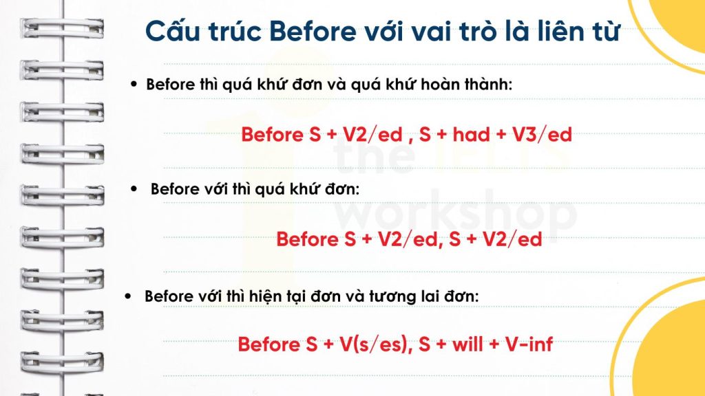 Trong tiếng Anh, cấu trúc “before” thường sử dụng để chỉ một hành động xảy ra trước một hành động khác. Khi có một mệnh đề được chia ở thì tương lai đơn, mệnh đề trước “before” thường sẽ ở thì hiện tại đơn. Ví dụ như trong câu “She studied hard before she took the test”, ta thấy rõ sự liên kết giữa việc học và việc thi.