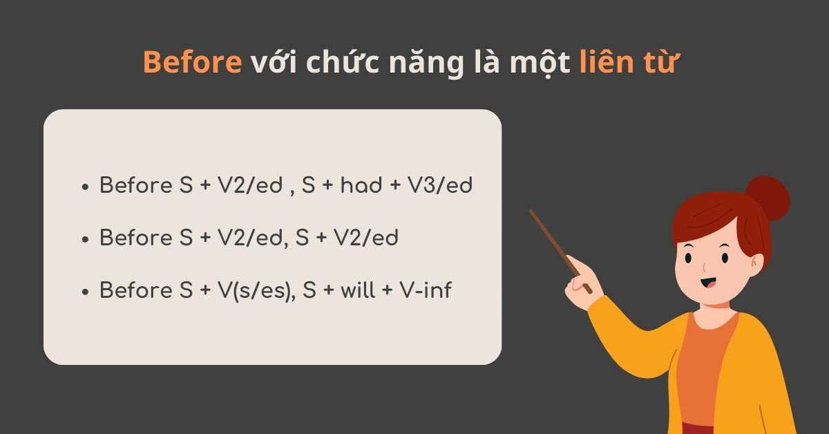 Before, trong tiếng Anh, có nghĩa là “trước đó”, và được sử dụng linh hoạt với nhiều vai trò khác nhau. Khi là liên từ, nó thường được dùng để nối các mệnh đề lại với nhau. Một điều thú vị là nếu trước “before” có mệnh đề chia ở thì tương lai đơn, thì mệnh đề sau nó sẽ dùng thì hiện tại đơn. Điều này giúp người nói có thể thể hiện ý nghĩa rõ ràng hơn về thời gian của một hành động.