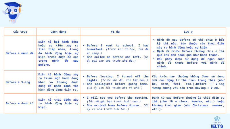 Trong tiếng Anh, cấu trúc “before” thường được sử dụng để chỉ một hành động sẽ xảy ra trước một hành động khác trong tương lai. Khi sử dụng, mệnh đề trước “before” thường chia ở thì quá khứ hoàn thành, ví dụ: “Before he left, he had finished his work.” Điều này cho thấy rằng công việc đã được hoàn thành trước khi anh ấy rời đi.