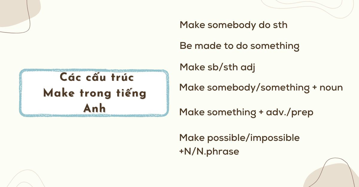 Ngoài ra, “make” còn có thể kết hợp với tính từ hay động từ -ing tùy thuộc vào ngữ cảnh. Việc hiểu rõ các cấu trúc liên quan đến “make” sẽ giúp bạn diễn đạt ý tưởng chính xác và tự nhiên hơn trong giao tiếp hàng ngày. Hãy thực hành nhiều để nắm vững hơn nhé!