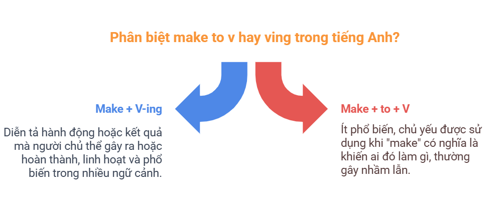 Khi học tiếng Anh, việc lựa chọn sử dụng “to V” hay “V-ing” sau một động từ luôn là vấn đề khiến nhiều người băn khoăn, đặc biệt với động từ “made”. Nhiều học viên phân vân không biết sau “made” dùng “to V” hay “V-ing” mới đúng ngữ pháp. Bài viết này sẽ giải đáp chi tiết những thắc mắc như: sau “made” là “to V” hay “V-ing”, cấu trúc chính xác của “made” trong câu, và những lưu ý cần thiết để tránh mắc lỗi khi sử dụng. Mời bạn cùng tìm hiểu để nắm chắc kiến thức quan trọng này!
