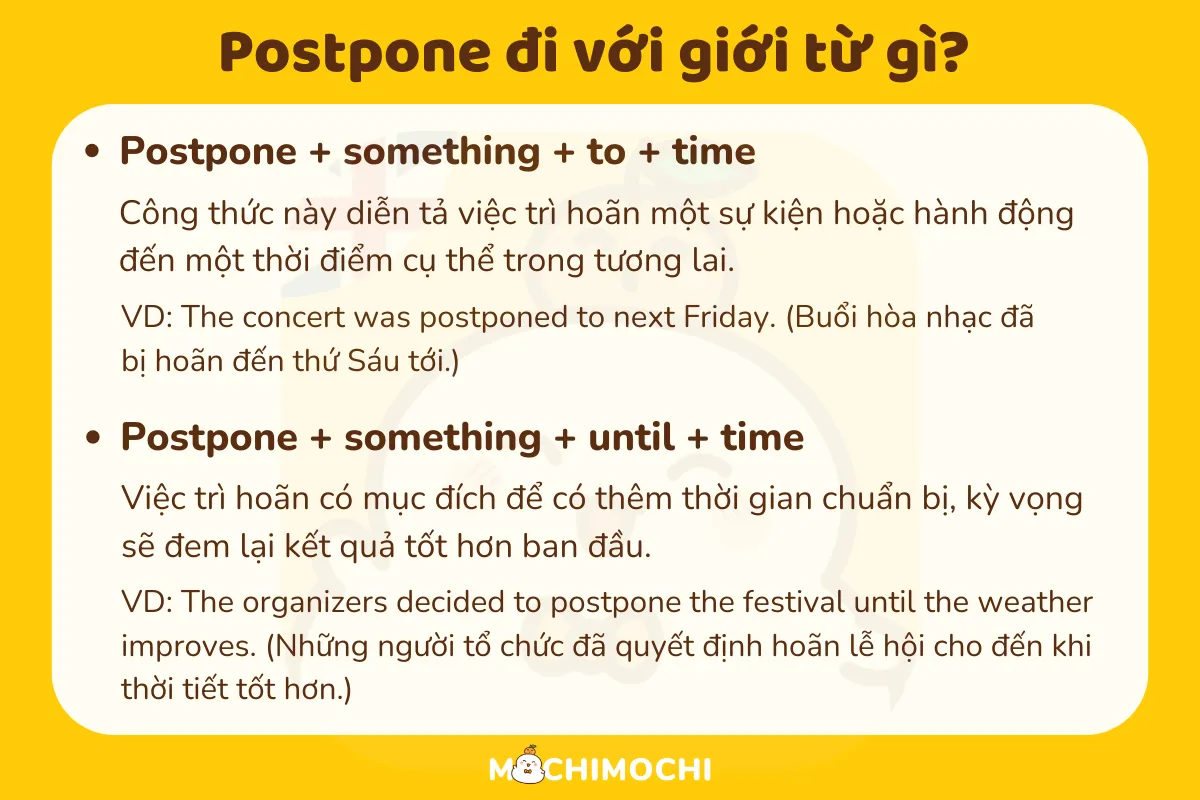 Khi sử dụng từ “postpone,” một trong những cấu trúc phổ biến mà bạn cần biết là “postpone + something + to + time.” Cấu trúc này cho phép bạn diễn đạt việc trì hoãn một sự kiện hoặc hành động đến một thời điểm cụ thể trong tương lai. Ví dụ, bạn có thể nói “We will postpone the meeting to next week,” để thông báo rằng cuộc họp sẽ diễn ra vào tuần sau thay vì thời gian đã định.