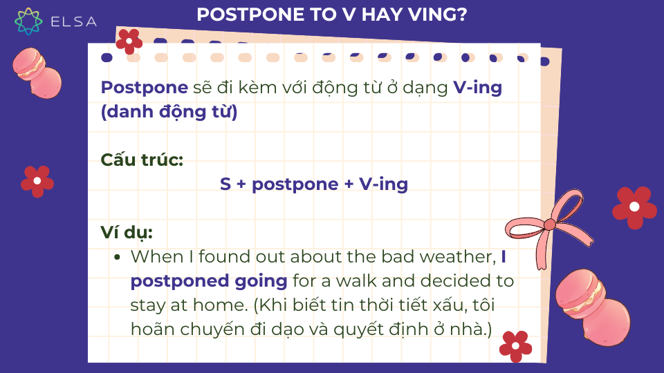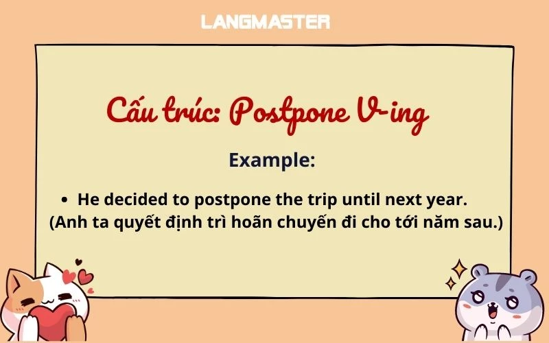 Đáng lưu ý, sau “postpone” luôn phải sử dụng dạng V-ing (danh động từ) để chỉ hành động bị trì hoãn, chứ không thể dùng “to V”. Cấu trúc thường thấy là: S + postpone + Ving + O. Việc sử dụng đúng cấu trúc sẽ giúp câu văn của bạn trở nên chính xác và tự nhiên hơn.