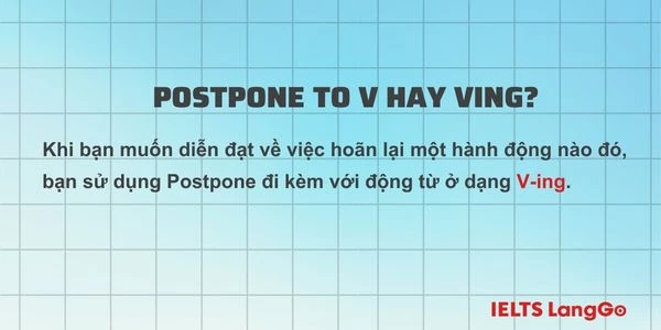 Postpone là một động từ phổ biến trong tiếng Anh, thường xuất hiện trong các tình huống giao tiếp hàng ngày và công việc khi nói về việc trì hoãn hoặc lùi lại một sự kiện nào đó. Tuy nhiên, không phải ai cũng nắm rõ sau postpone là to V hay V-ing, cũng như cấu trúc và cách sử dụng từ này trong câu. Ở bài viết này, chúng ta sẽ cùng tìm hiểu chi tiết về cấu trúc, ý nghĩa, cách dùng và phân biệt postpone với các động từ tương tự, qua đó giúp bạn sử dụng từ này thành thạo hơn trong tiếng Anh.