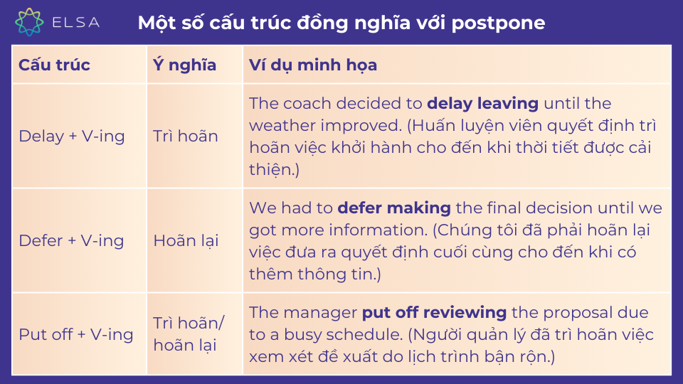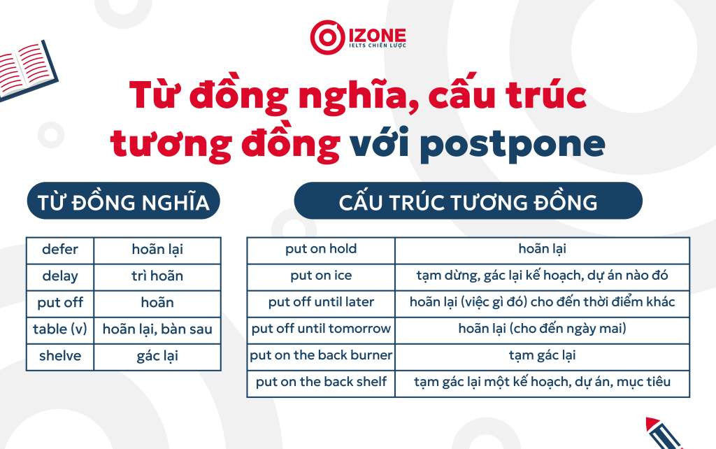 Một số từ đồng nghĩa với “postpone” như “delay” hay “put off” cũng có thể được sử dụng trong ngữ cảnh tương tự. Tuy nhiên, bạn nên lưu ý để tránh nhầm lẫn giữa các cấu trúc, nhằm tạo ra câu văn chính xác và tự nhiên hơn.