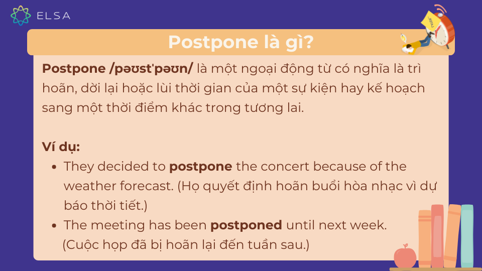 Postpone là một thuật ngữ quen thuộc trong cuộc sống hàng ngày, thường được dùng khi chúng ta phải hoãn một sự kiện nào đó. Ví dụ, khi thời tiết xấu khiến cuộc họp không thể diễn ra, người ta thường nói rằng “Cuộc họp đã bị hoãn đến thứ Hai tuần sau.” Sự thay đổi này giúp mọi người sắp xếp lại lịch trình một cách thuận lợi hơn.
