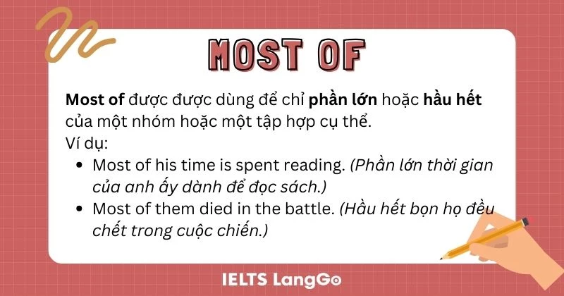 Ngược lại, “most of” lại có cách sử dụng khác biệt. Từ này đi kèm với danh từ xác định và thường có một từ chỉ định đứng trước, như “the”, “my”, hay “these”. Ví dụ, câu “Most of the cake was eaten” cho thấy rằng phần lớn chiếc bánh đã được ăn, nhưng không xác định cụ thể là ai đã ăn.