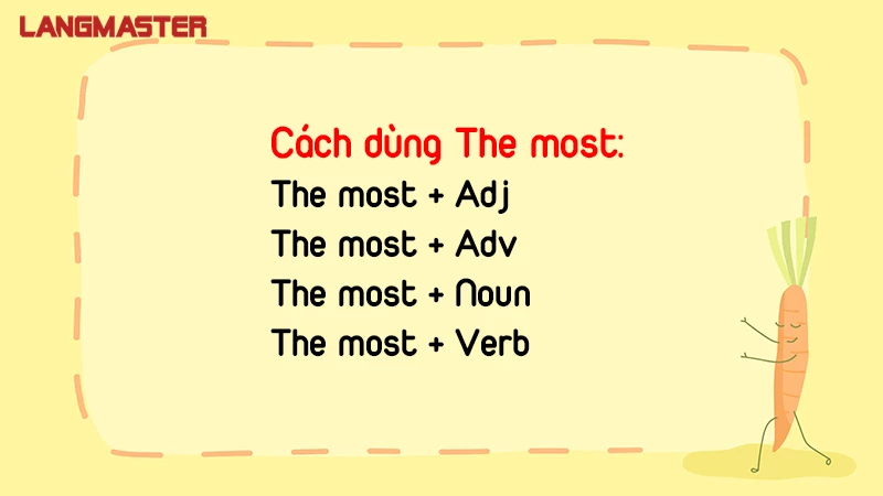 Khi sử dụng “the most” trong tiếng Anh, chúng ta thường gặp cấu trúc sau: “the most + adjective/adverb”. Dạng so sánh nhất này được dùng để chỉ cái gì đó có mức độ cao nhất trong một nhóm. Ví dụ, nếu bạn nói “Yuri earns the most money in her family,” tức là bạn đang khẳng định rằng không ai trong gia đình của Yuri kiếm được nhiều tiền hơn cô ấy.