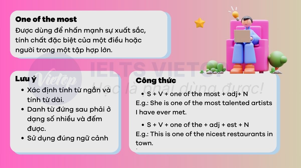 Không chỉ dừng lại ở đó, “most” khác với “more” ở chỗ nó không chỉ đơn thuần là so sánh giữa hai đối tượng mà còn mang nghĩa “nhiều hơn tất cả”. Đây là lý do tại sao khi nói đến những điều tuyệt vời nhất trong cuộc sống, chúng ta thường sử dụng cụm từ “one of the most,” tức là “một trong những… nhất”. Như vậy, cụm từ này không chỉ phong phú về nghĩa mà còn rất đa dạng trong cách áp dụng.