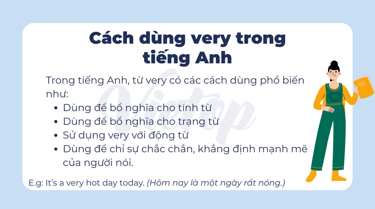 Trong tiếng Anh, “very” là một từ quen thuộc và được sử dụng thường xuyên để nhấn mạnh mức độ của tính từ hoặc trạng từ. Tuy nhiên, không phải ai cũng nắm rõ cách dùng “very” sao cho chính xác, cũng như các quy tắc đi kèm khi kết hợp với các loại từ khác nhau. Việc hiểu rõ “very” đứng trước từ loại nào, cấu trúc sử dụng ra sao, hoặc phân biệt “very” với các từ khác như “too” là điều vô cùng cần thiết, giúp nâng cao kỹ năng ngữ pháp và diễn đạt tiếng Anh tự nhiên, hiệu quả hơn. Bài viết sau sẽ giúp bạn giải đáp tất cả những thắc mắc này.