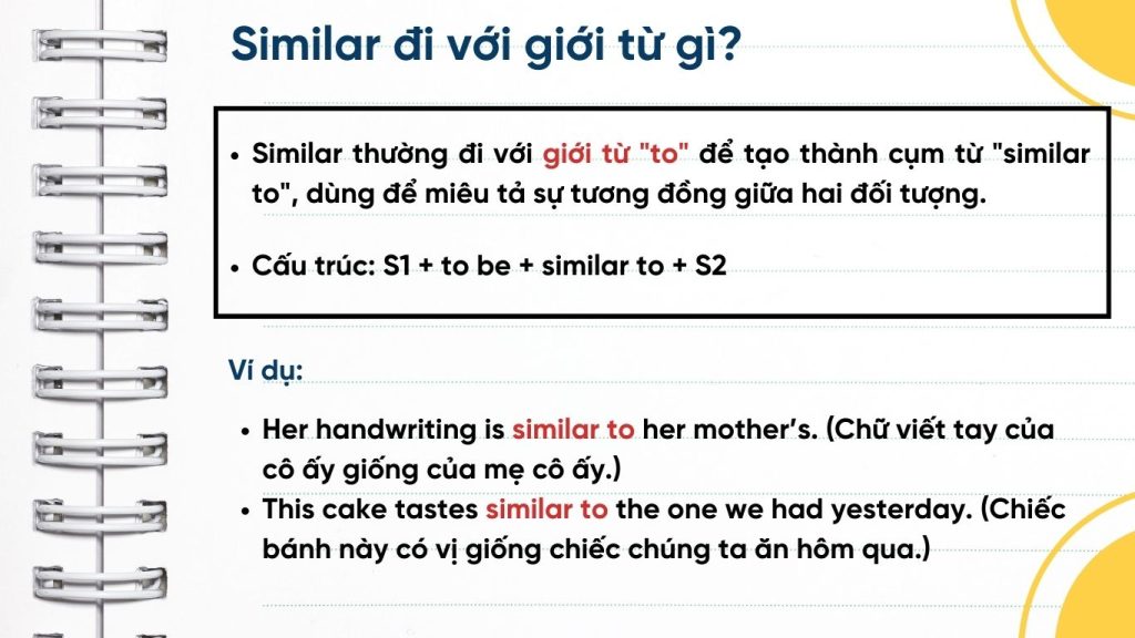 Khi sử dụng từ “similar,” chúng ta thường phân biệt giữa hai cấu trúc: “similar to” và “similar in.” Cụ thể, “similar to” được dùng để so sánh một người hoặc vật thể có nét tương đồng với một đối tượng khác. Ví dụ, khi tôi nói “My mother and I have similar tastes,” điều đó có nghĩa là mẹ tôi và tôi có những sở thích tương đồng.