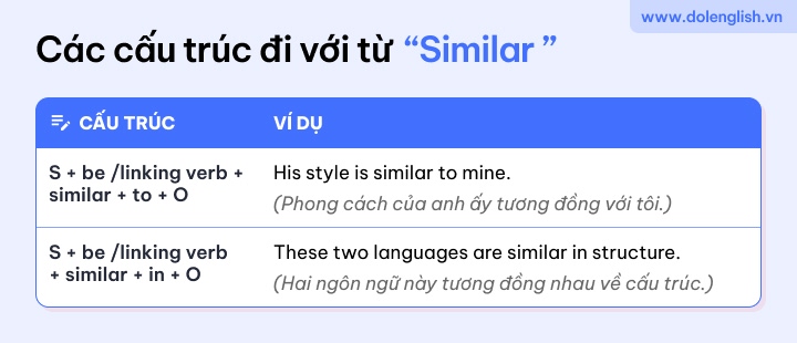 Cấu trúc thường gặp là “S + to be + similar to/in + N,” và khi áp dụng cấu trúc này, bạn sẽ truyền tải được ý nghĩa rõ ràng hơn. Nếu bạn thường nhầm giữa “like” và “similar,” hãy nhớ rằng “like” thường được sử dụng trong những câu so sánh hình thức, trong khi “similar to” nhấn mạnh sự tương đồng cụ thể hơn giữa hai đối tượng.